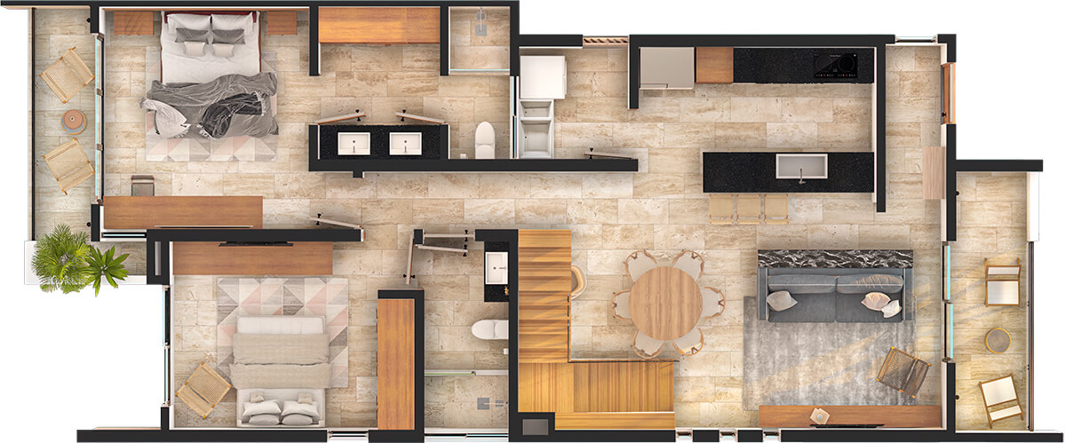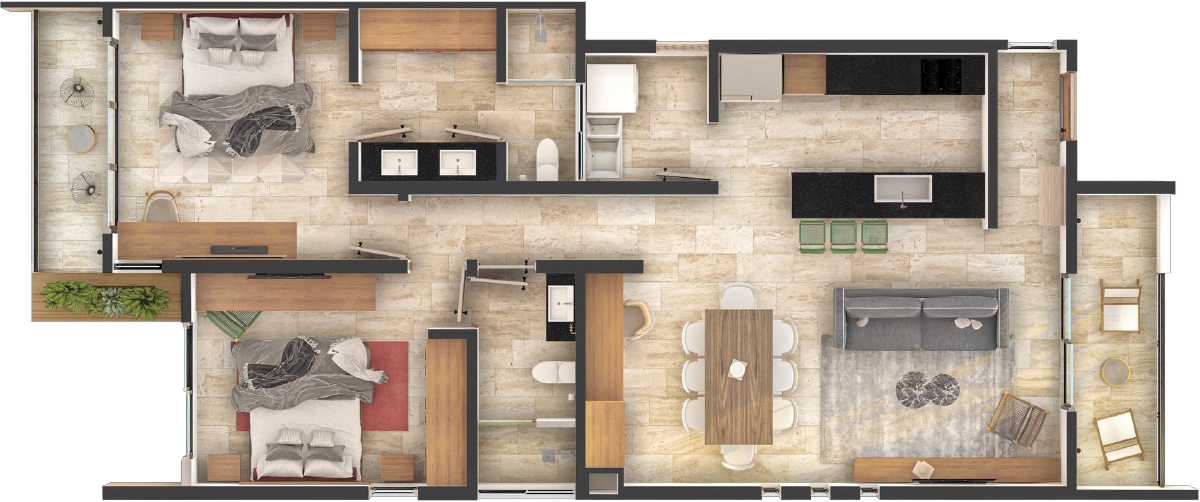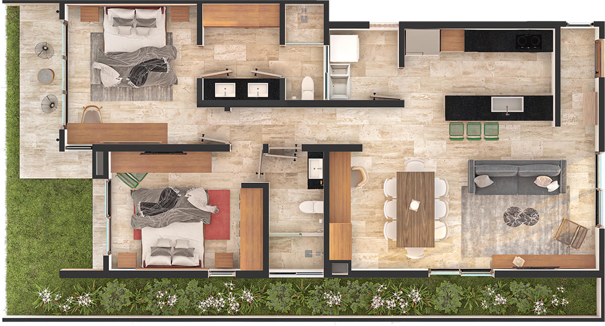 Todos nuestros departamentos cuentan con más de 100 m2 de construcción, brindándote un lugar amplio y confortable para disfrutar, con orientación norte-sur, para aprovechar la ventilación e iluminación natural.